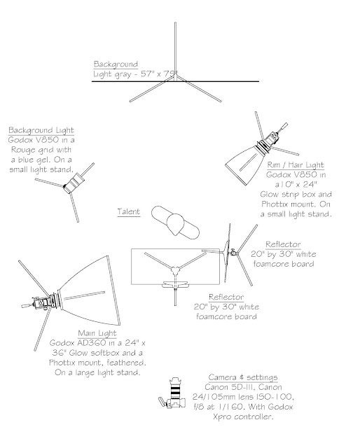 I positioned the main light so that my granddaughter will be lit with the edge of the light as it goes buy and the light will drop off before it hits the background. This way my granddaughter will be lit properly, and the background will present as black. Adjust the power of the main light to f/8. The Rim/Hair light will be one stop below the main light, f/5.6. The background light and the reflectors will be adjusted to taste.